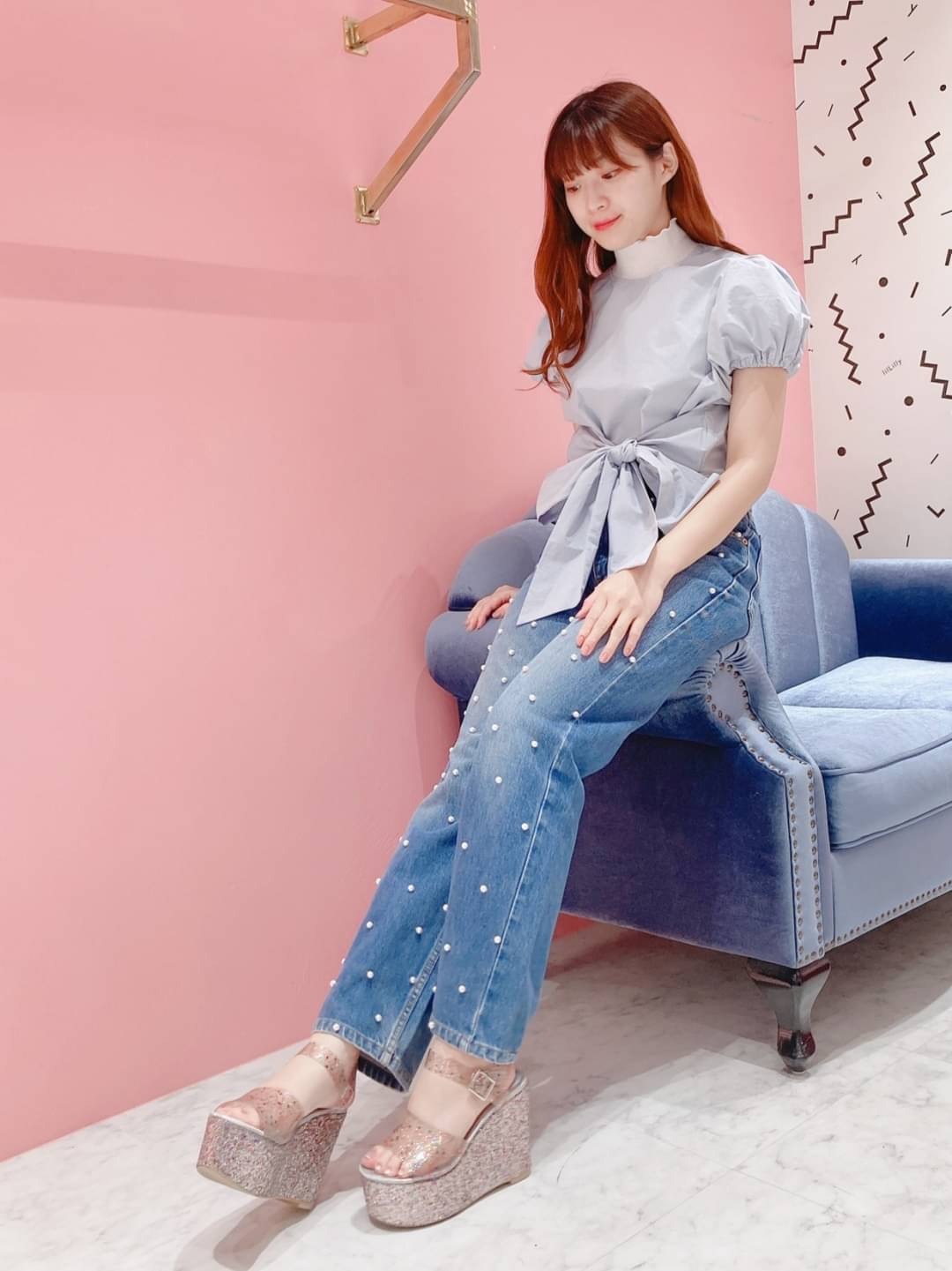 ガーリーなブラウスをデニムでほんの少しカジュアルダウンさせたコーディネート✨