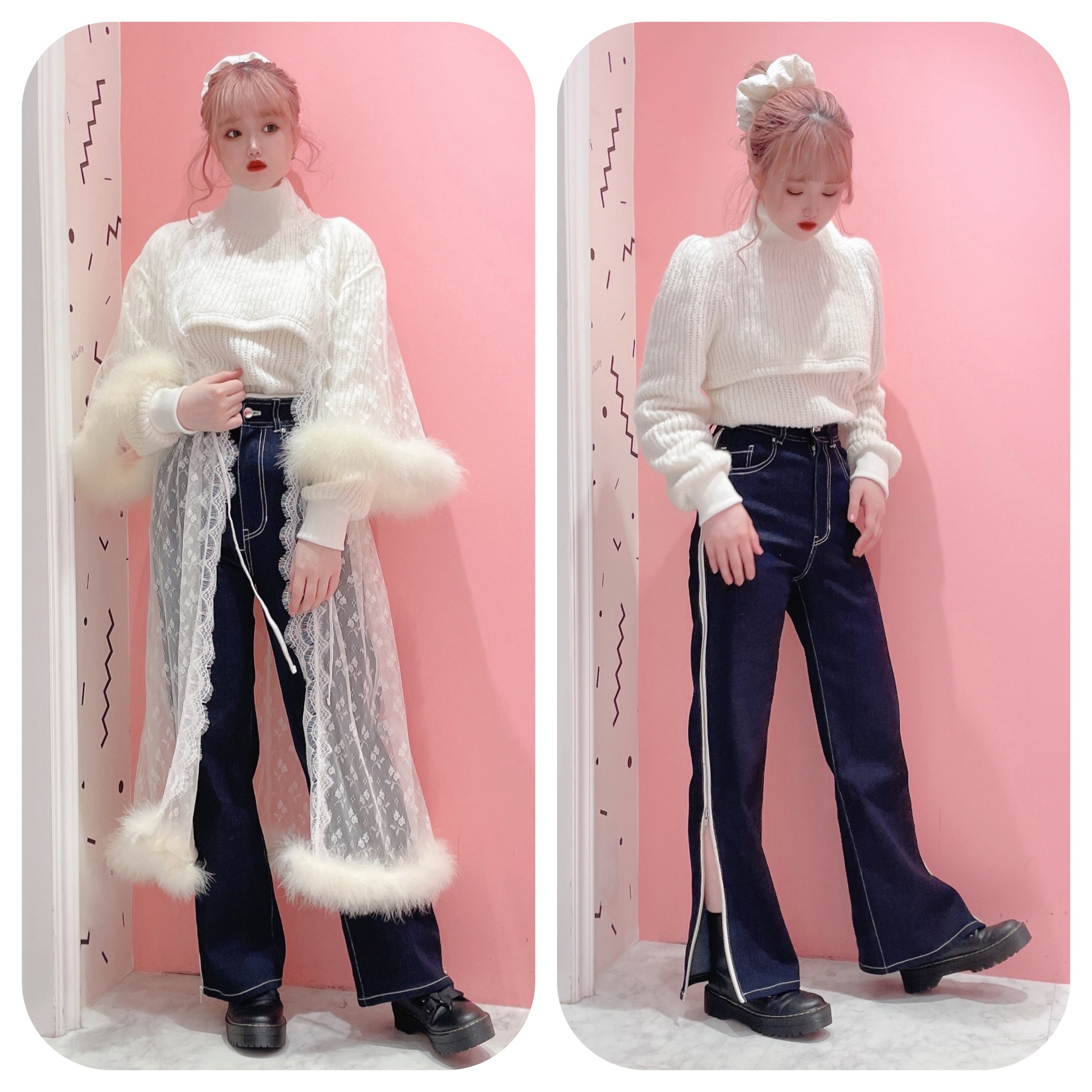 そしてお袖は袖口にかけて大きく広がる為、ニットやパーカーなど厚手の冬物に合わせる事も出来、春前から取り入れやすいデザインです🥰