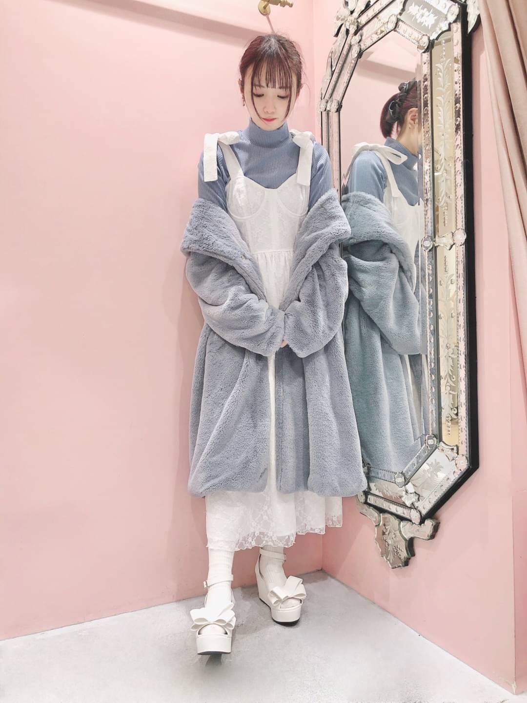 大人っぽい印象の深いBLUE、中にレースドレスを合わせてガーリーに着てみました💙