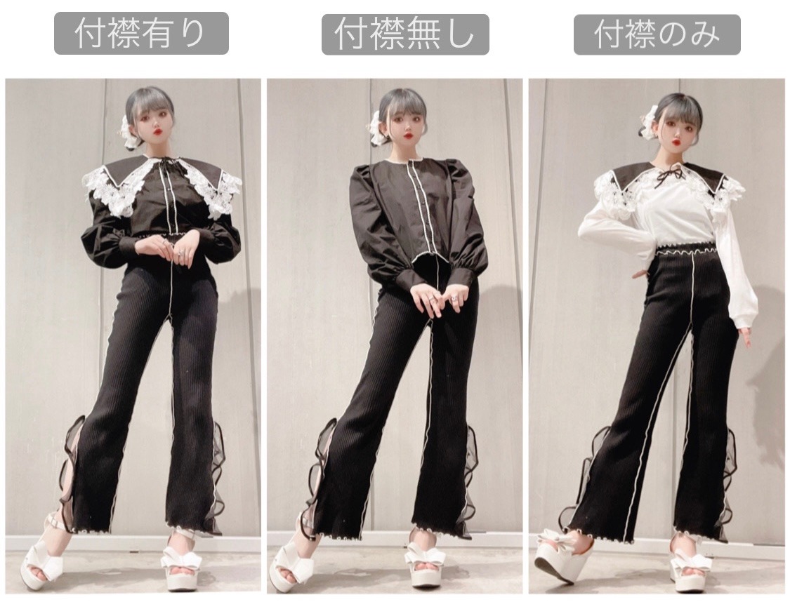 付襟のみ使い回す際、今回はロンTを合わせましたがニットやスウェット、ワンピースにブラウス、春アウターなど…合わせ方は無限大ですのでお気に入りの組み合わせを見つけて下さいね🧚🏻