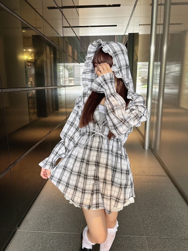 チェックフリルフーディーワンピース