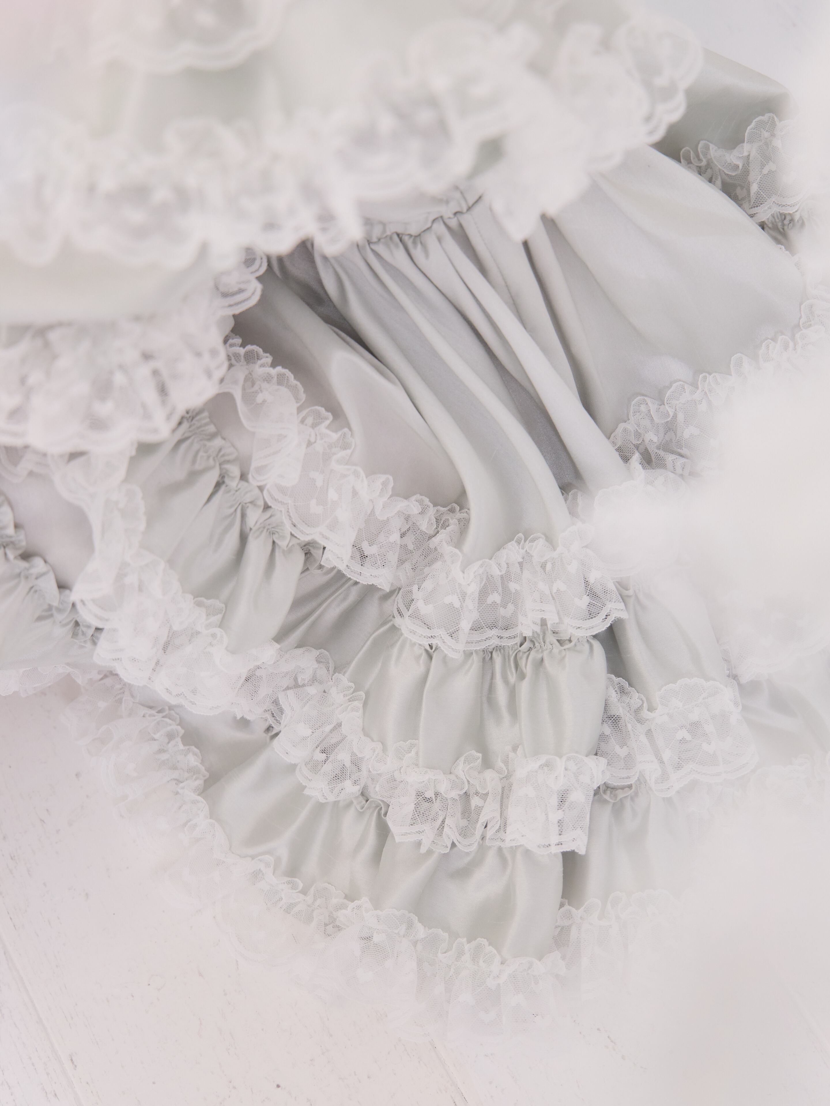 シャンタン生地が上品に輝く、フリルたっぷりのドーリーワンピース。