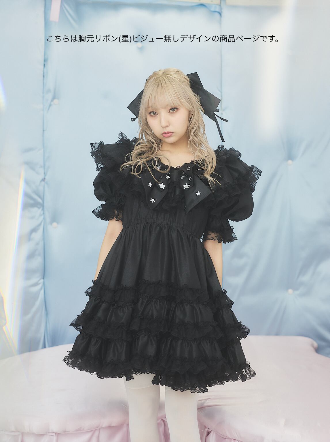 ボリューム感のあるパフスリーブと、胸元にあしらわれた大きなリボンが印象的。