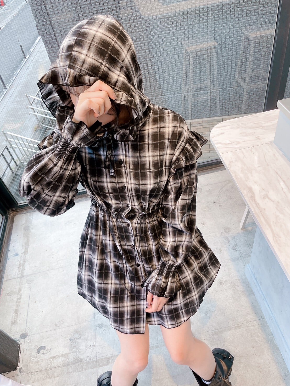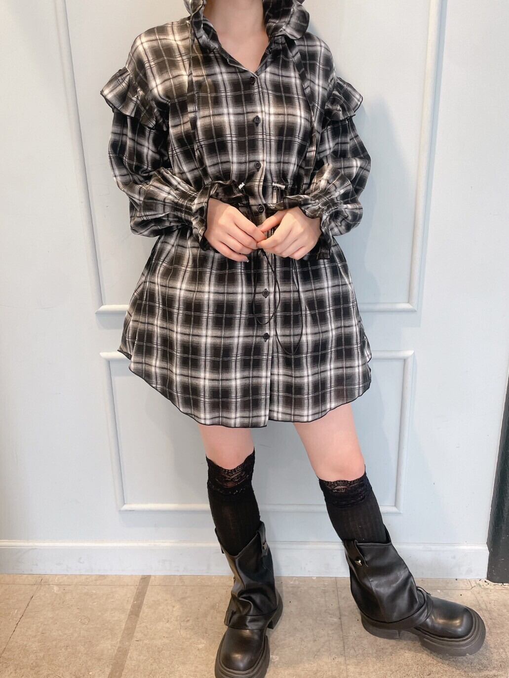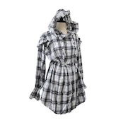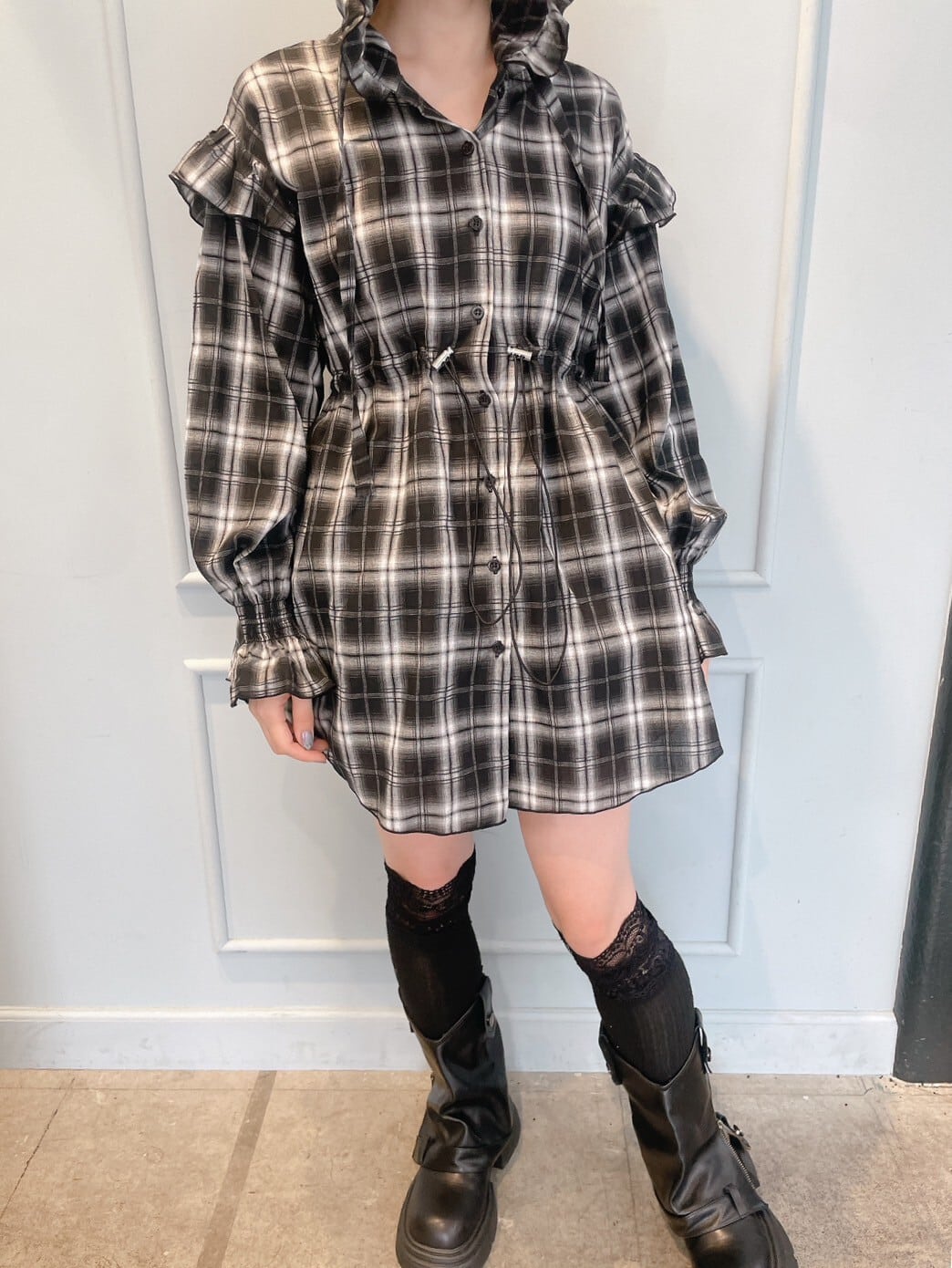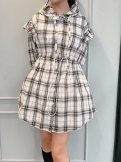 チェックフリルフーディーワンピース
